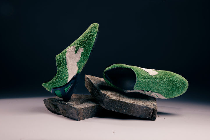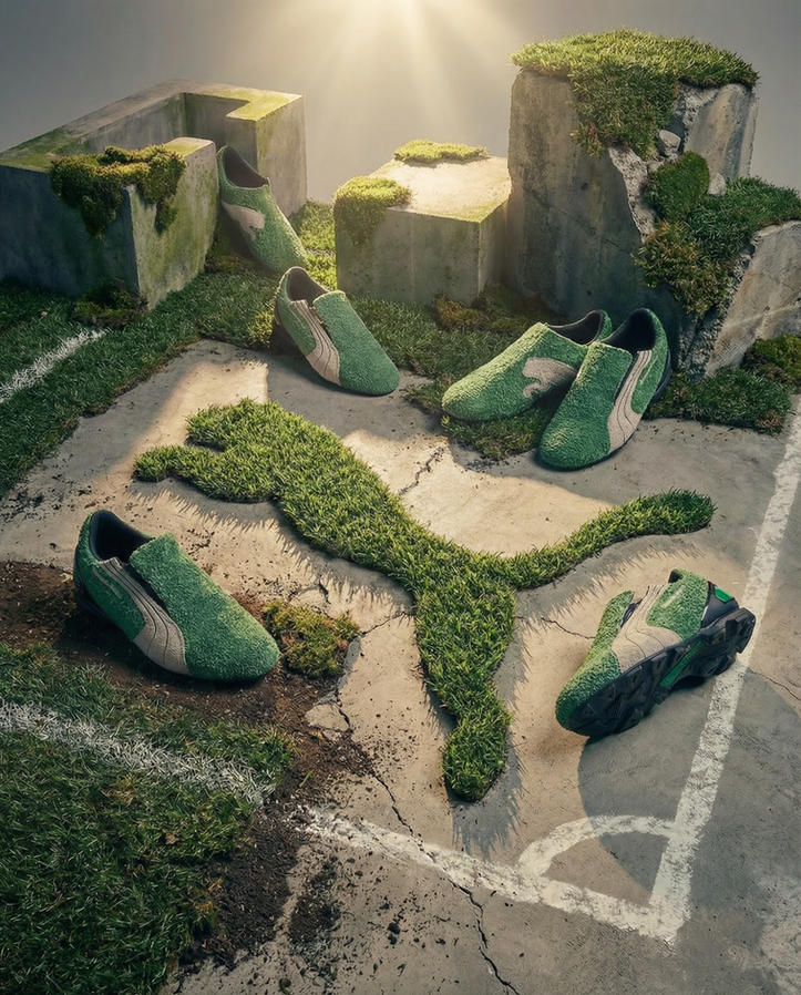 Warner positioned the shoe against hard surfaces including concrete and studio stone, using bold, directional lighting to draw out the shoe's turf-like texture and sculptural form. The images were treated with a cinematic grade to enhance mood and scale.